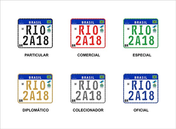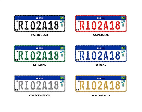 A cor de fundo da placa é sempre branca e não muda conforme o tipo de veículo como no modelo anterior. O que muda é a cor das letras, dos números e da borda da placa. Veículos particulares, comerciais, oficiais, diplomáticos, especiais e de colecionadores apresentam, respectivamente, as cores preta, vermelha, azul, dourada, verde e prateada. As placas de motos seguem o mesmo padrão das placas de carros, mudando apenas a dimensão, que é 20 cm x 20 cm.