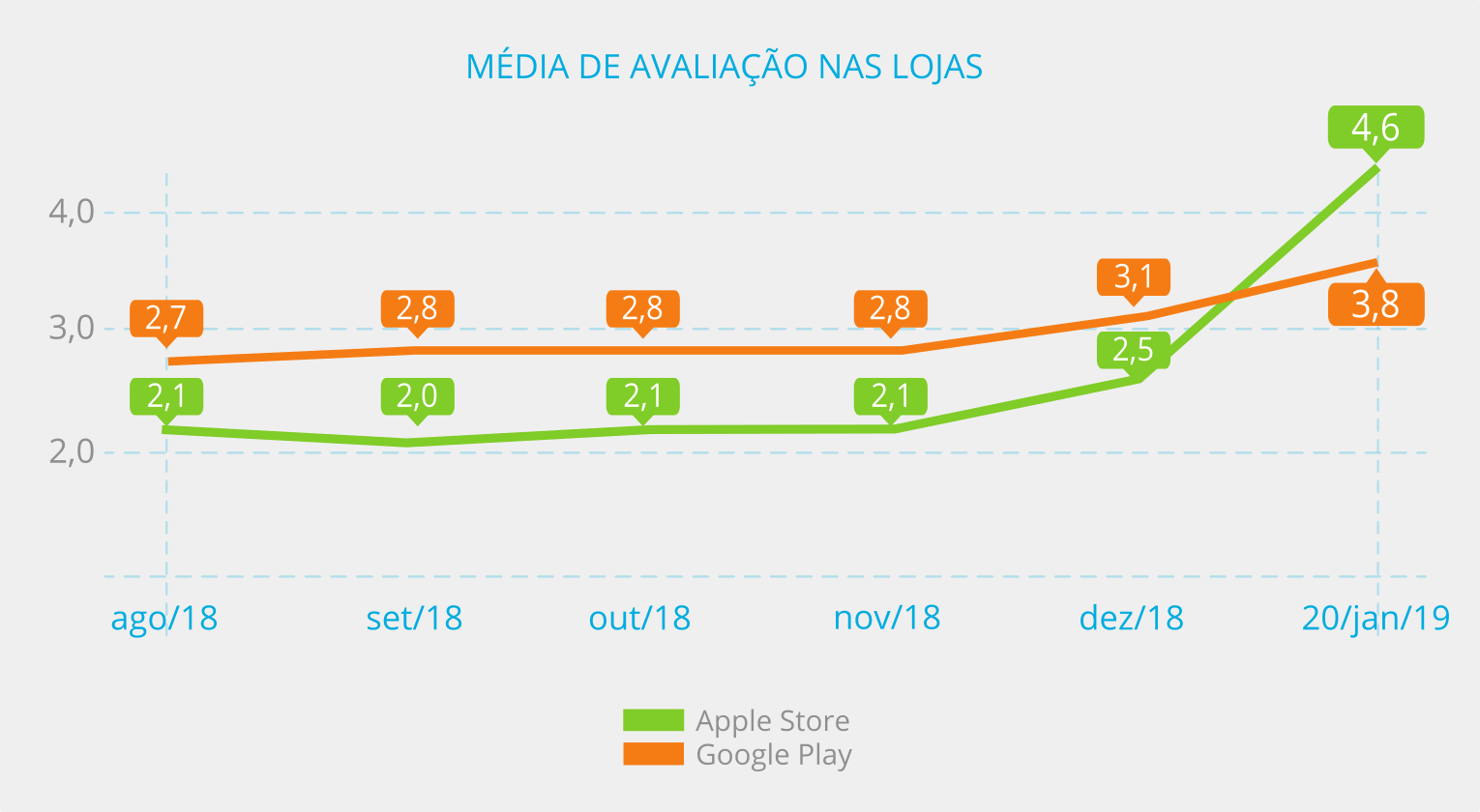 Vale destacar, também, o aumento significativo das notas de avaliação dos aplicativos no período de 20 de dezembro a 20 de janeiro nas lojas Apple Store, que passou de 2,5 para 4,6 estrelas (pontuação máxima 5 estrelas) e Google Play, que passou de 3,1 para 3,8 estrelas (pontuação máxima 5 estrelas).